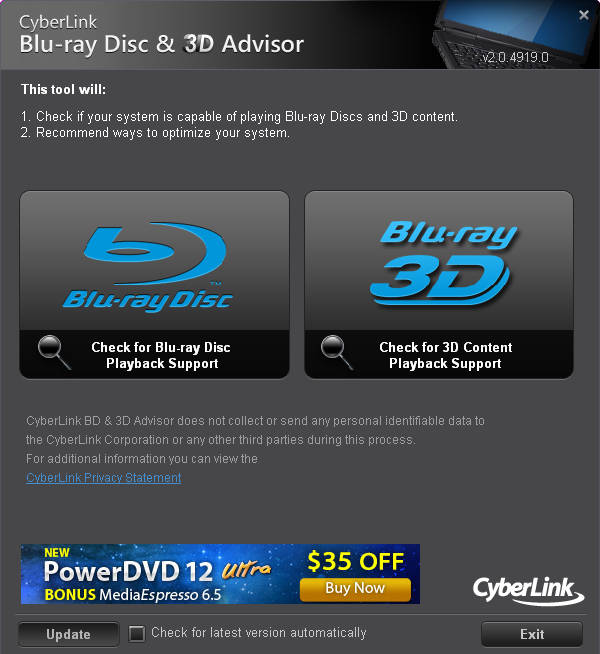 Cyberlink BD & 3D Advisor is a small utility whose main purpose in life is to test PCs in order to see if they are capable of playing Blu-Ray video quality and if the monitor can display 3D image properly. This is not an advanced application, it’s very simple and pretty much straightforward.