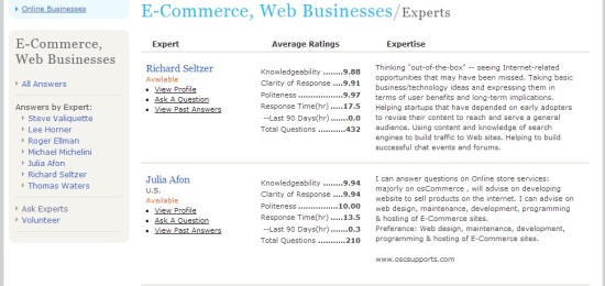AllExperts is another free online source to get expert help. The service provide thousands of skilled professionals to help you on a wide variety of topics. You can search for your query and look for the matching results, or simply browse through the given categories (and sub-categories), and navigate to a particular subject. Once you reach the desired category, you would be able to see the list of experts available to answer your queries. A short description regarding the expert’s expertise and his/her rating is also available for your reference.