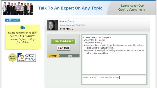 You can also check user reviews/ratings, and leave your own feedback based on your chat session with the expert. I had a live text chat with one of the experts. Though I tried searching for other modes (voice or video chat) as well, I was not able to figure out whether they were available. Try on your own and see if they exists.