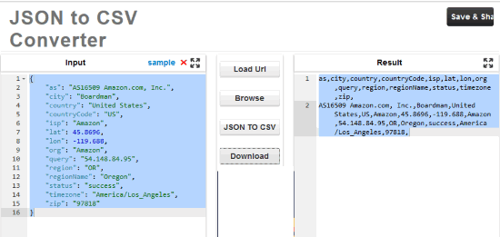 JSON to CSV Converter (Homepage) is one of my favorite websites in this list. Its feature to add input JSON file in different ways makes it very useful. You can paste text of JSON file, upload JSON file from PC, Load URL of JSON file, or create a new JSON file and then download the output as CSV document.
