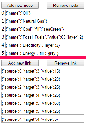 As I mentioned, to draw a Sankey diagram on this website, you will have to define the nodes and all the links with values between these nodes. Let’s see how you can add nodes and define links between them to generate a Sankey diagram out of them.