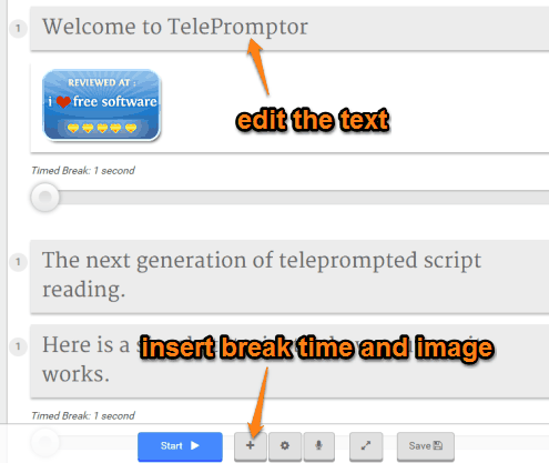 When you have prepared the script, it’s time for practice. Press the Start button and your script will play. Now read the coming text, take the break as come, and be like professional.