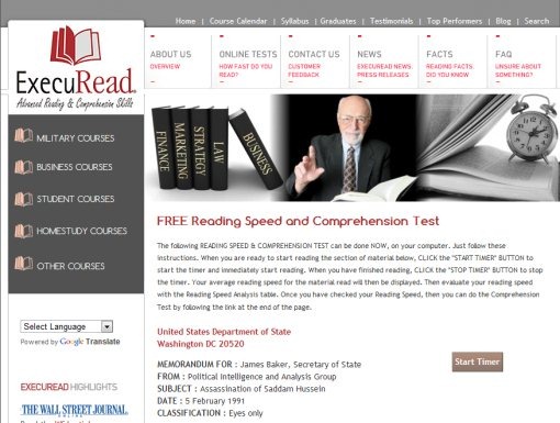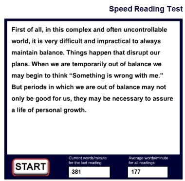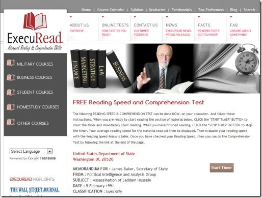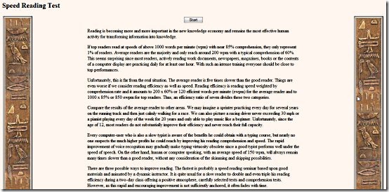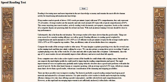 ExecuRead is another website that offers you with free speed reading test and comprehension test. Like other websites, this website also offers a reading material to read and test the reading speed. For starting the test, you need to click the Start button above the passage and immediately start reading. And whenever, you finish reading this passage, you simply need to click the Stop button below. Now, this website to test reading speed will show you the average reading speed and optionally you can even take the comprehension test. In addition, you can compare the your speed reading test result with reading speed analysis table on this website to know your position on the table.