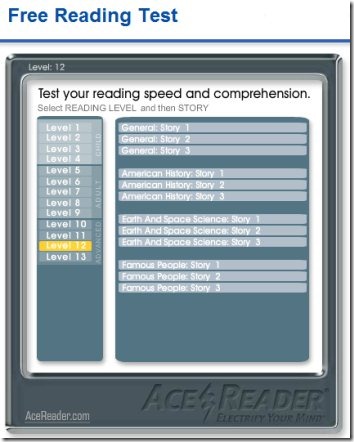FreeReadingTest is another free online service that let’s you test reading speed online. Unlike other speed reading services, this free service let’s you take comprehension test immediately after speed reading test. It’s must that you take comprehension test, as it shows you the speed reading test results only after taking the comprehension test. Comprehension test ensures that you read the text carefully, and not just skipped over the text to get a better reading speed. This free tool includes 13 levels distributed among child, adult, and advanced users. So you can choose any level and a story to read. Click the start/stop button, and start reading the passage, whenever you finish reading the passage simply click the start/Stop button again to stop the test and take the comprehension test. After taking the comprehension test, it shows you the combined results of both speed reading test and comprehension test. Try FreeReadingTest to test reading speed.