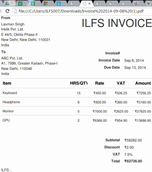 In above screenshot, you can see PDF file of my sample invoice generated with the help of this website.