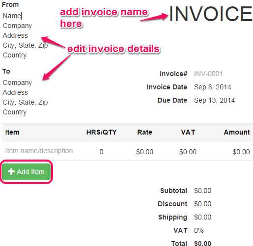 Using Add Item button, you will be able to enter item name, quantity, and price. VAT (value-added tax) will depend on the VAT percentage set by you (if VAT is added). And total amount for each item is added automatically.