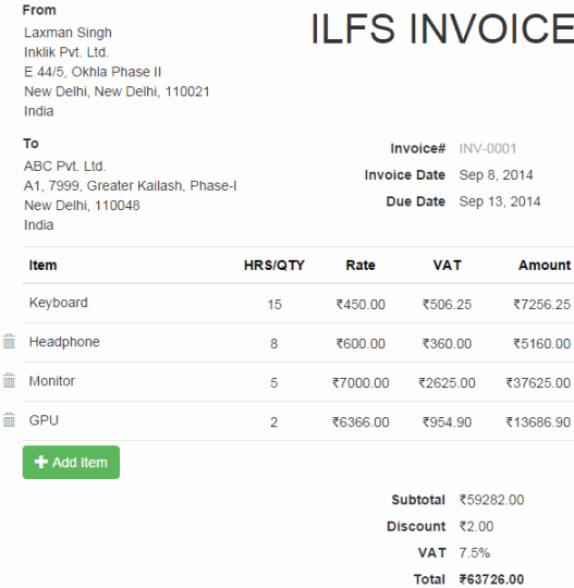 All the tax and discount options are added to bottom right side of your invoice and you can manually enter details (discount percentage, VAT percentage, etc.). Based on all the added items and charges, final total and invoice is created. See the screenshot below: