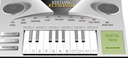 The first website to play piano online is Virtual Keyboard. This is a very simple to use website where all you have to do is play piano. On the beautiful looking interface, you will find a virtual piano that you can straightaway start playing. An instruction tab is provided for you, that opens in a separate window, where you can learn about the controls of the piano. Separate keys are assigned beforehand that you have to use to play the piano. The features of Virtual Keyboard include a Chord Mode, and different drum beats that you can play in background, while playing the piano. Lastly, apart from a virtual piano, the website also lets you play virtual flute, guitar, and some other instruments.