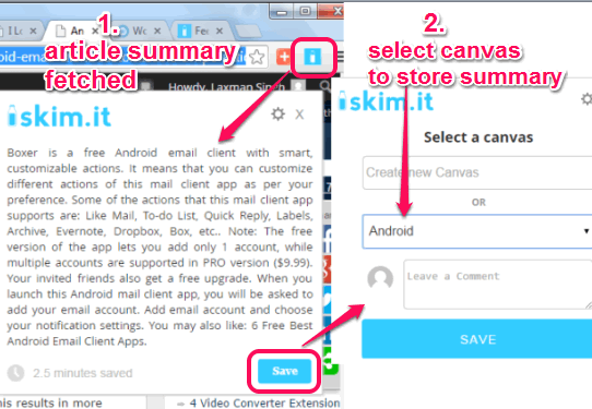 - You can install its Chrome extension and use the extension icon to automatically fetch article summary from a webpage. A pop up is opened to show you article summary, like visible in screenshot below. You can use Save button and select the canvas to store extracted summary to your account. If you are not logged in to your Skim.it account, then first it will prompt you to login to your account. You may use this link to install its extension.