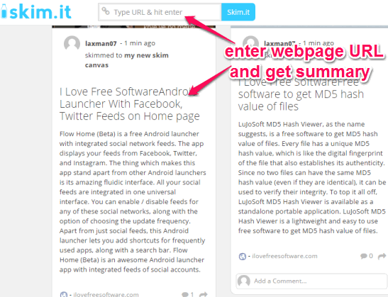 Skim.it is a free website that helps to automatically get 100 words summary for a webpage. Webpage summary can be saved to your Skim.it account and shared publicly as well. You can either use it with its Chrome extension or from any other web browser. Benefit of using its Chrome extension is that it will automatically fetch webpage summary as soon as webpage is loaded. On the other hand, using it without extension will require you to open your account, and manually enter the webpage URL to fetch webpage summary.