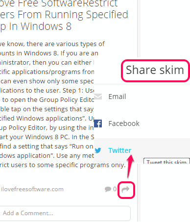 - You will be able to share your article summary (known as Skim) link to Twitter, Facebook, or can send email to friend. People will also be able to comment to your skim. Only registered users can comment.