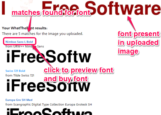 WhatTheFont is a free website to identify font from an image. It analyses font present in an image character by character. Once the analysis is completed, it provide best results that match with the font present in that particular image. Once you have identified the correct font, you can buy it from the website, or download it from any other place.