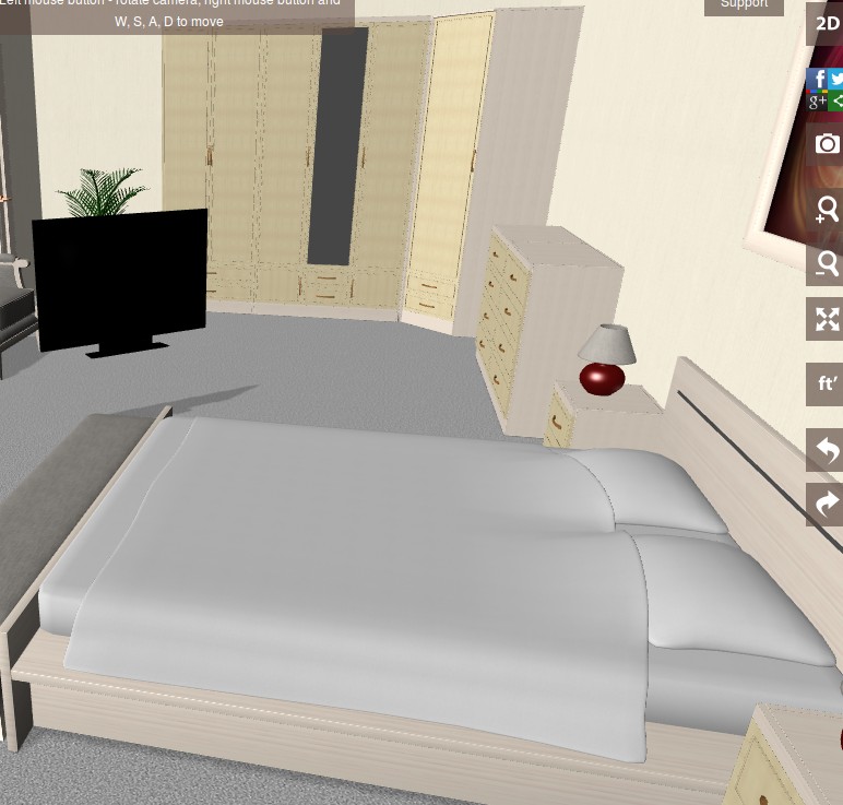 Click on the 3D button from the top of the right sidebar to view the created floor plan in three dimensions. You can walk through it like you would in a video game, a first person shooter type of floor plan preview. When you’re done, your work can be saved, shared in the gallery or shared with your friends using social networks, all of which can be accessed from the right sidebar.