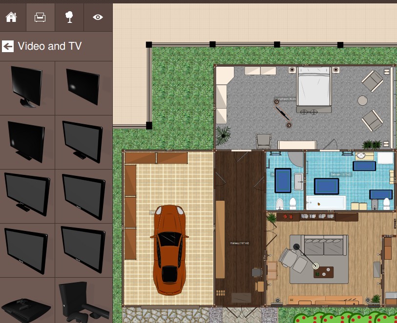 Part of Planner 5D’s interface can be seen on the image below. This is the left panel where objects which you can add to the floor plan can be found. Four tabs in the upper left corner of the screen are for switching between room layout setup tools, objects for interior and outdoor designing and for managing layers.