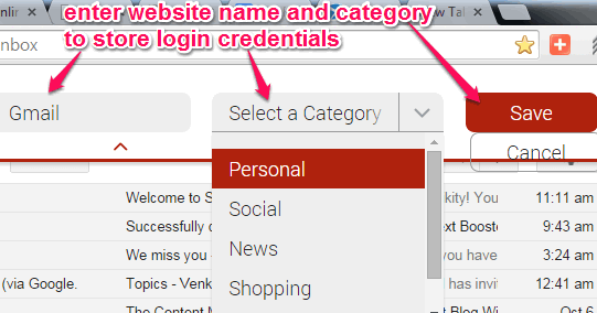 Step 3: Go to a particular website, and enter username and password. When you will login to that website, a pop up will open at top of webpage, like visible in screenshot below. In that pop up, you need to enter the name of that website, and select a category to store that website credentials to your Splikity account. By default, Personal, News, Shopping, etc. categories are available. But you can create your own category as well.