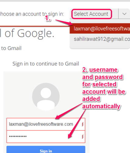 Step 4: This step helps to automatically login to any of the stored website. Whenever you will access a particular website, it will automatically add username and password at the required fields. If you use to sign in with different accounts to same website, it first lets you choose the required account for sign in, and auto insert username and password for that account.
