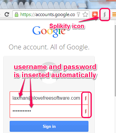 In above screenshot, you can see login credentials are filled automatically whenever you will come to a website whose credential have been stored by you to Splikity. It is a valuable online password manager and uses military grade encryption to protect your saved passwords.