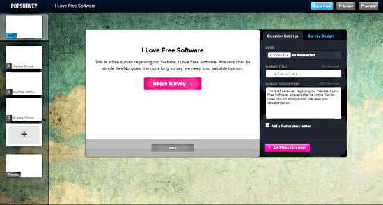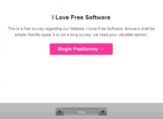 PopSurvey is a free web app which functions as an online survey creator. It helps you create professional online surveys within a short time. An online survey creator helps you gather feedback from your spectators which may help you gain a valuable insight. And the best things is PopSurvey is available for free.