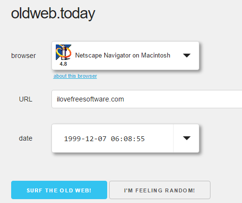 oldweb.today is a free website to view old versions of websites in a browser emulator. You need to first enter the address of some website, a specific date, and select a particular browser (Firefox, Chrome, IE, Safari, Netscape, etc.). After this, it generates the result and the emulator shows the version of that particular website for the specified date. It’s a good way to check if a website is changed since past or not.