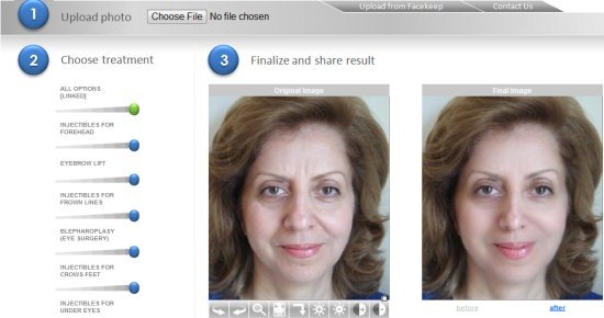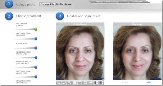 The best part about this free virtual cosmetic surgeon is the you do not need to download any software or application. You just need to logon to the website, upload a photo and start adding younger looking effects to photo.