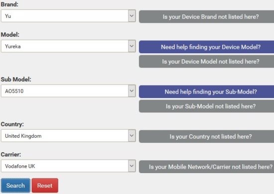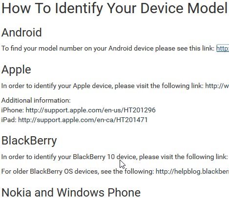 In case you don’t know the model number then click on the button opposite the drop down menu which says “need help finding your device model”. This will open up another page in new tab which will help you in identifying your device model. The devices are categorized under Android, Apple, Blackberry, Nokia and Windows phones. There is a YouTube video under each category to help you easily identify your device model name or number.