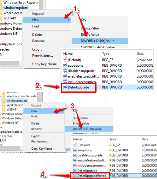 Step 2: Now under windowsupdate key, you need to create two DWORD (32-bit) values and name them as “DeferUpgrade” and “DeferUpgradePeriod“.