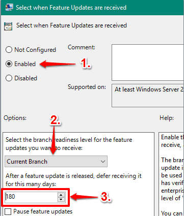 - Double-click on the first option. It will open a new window. Here, you need to select Enabled → choose Current Branch under Options menu → and set the number of days to defer feature updates. The maximum value is 180.