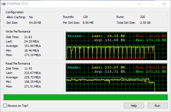 Setup is where DiskMark falls a bit short when compared with all the other applications. I’m saying this because setup isn’t easy to figure out, and the default test parameters like test file size, number of test runs, and so on is not the best for SSD testing. They need to be increased to give more accurate readings. Make sure to go through the help files to figure out how to tweak the test parameters. They are asked and need to be set every time you click on the “Run” button.