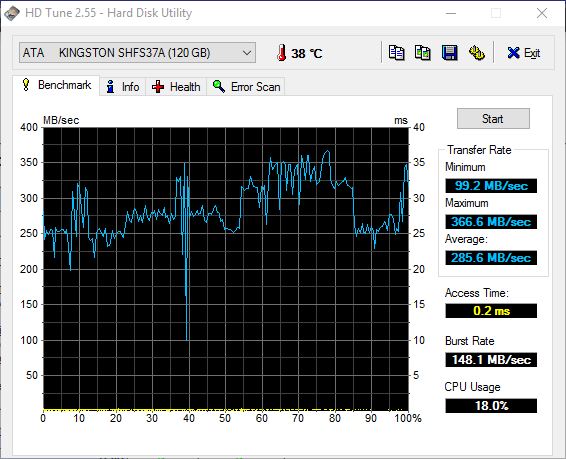 “Benchmark” tab is the one that interests us, because that’s where speed test is performed. There’re aren’t any settings that can be tweaked. Just click on the “Start” button to initiate the scan. Diagram gives you real time readings of the hard disk speed. Test is completed once the diagram reaches 100%. Results offer info like the minimum, maximum and average transfer rates, access times, burst rate, and CPU usage during the test.