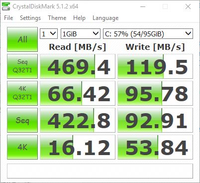 Setting up the speed test is easy. Just select the test file size (I usually use 1 GB) and the number of write/read passes you want the application to perform. Multiple passes give you more accurate results. Also don’t forget to select the partition that you want to test out. Results are clearly displayed and easy to read. By default CrystalDiskMark tests with random data (un-compressible).