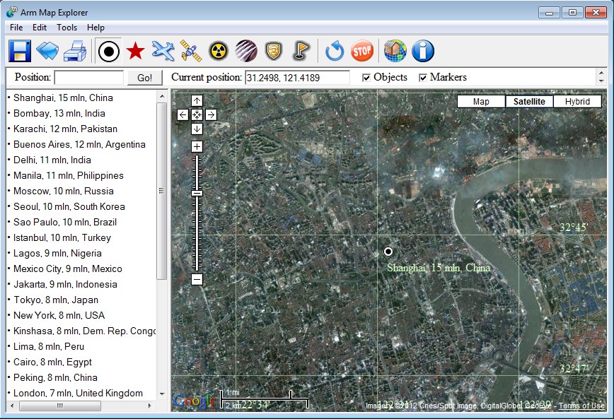 Arm Map Explorer is a free Google Maps browser for Windows which you can use in order to view Google Maps in a whole new way. This free Google Maps viewer comes with built-in lists of largest cities, capitals, airports, military sites, power plants, and several other lists of important locations from all over to world. Maps that you view can be easily printed or saved on the computers.
