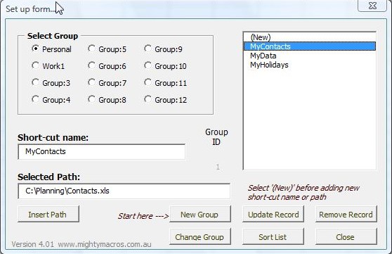 The add-in is accessed by right clicking on spreadsheets and selecting Short-cuts from the menu that pops up. Once you do that you should see the menu which can be seen in the first image above. To start editing groups and adding shortcuts to spreadsheets, you’re gonna have to click on the Enter/Shortcuts/Groups button.