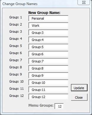 Once you do that, list of 12 available group slots will appear. They are gonna have generic names, here you can change them to something more descriptive of the spreadsheets shortcuts that you plan on putting there. Click update when you’re finished and now the list in the main control panel should be populated. with names of the created groups. Left double click on a group name there will open up additional menu where you can actually select and create spreadsheet shortcuts.