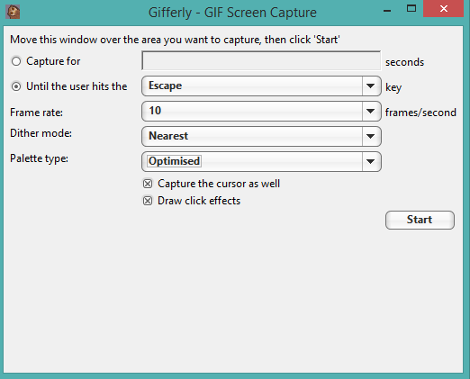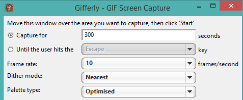 You can start recording in full screen or only a part of your desktop screen. Apart from this, you can also set time to automatically stop the recording. Moreover, option to set frame rate, select dither (white noise added to recording) type, and palette type is also provided by this handy gif screen recorder.