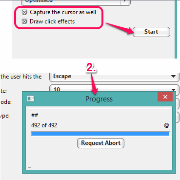 On the bottom middle part of its interface, options to capture mouse cursor, and click effects are also present that are enabled already. However, you can disable these options, or can keep them activated. After adjusting all the settings, tap on Start button, and recording will start.