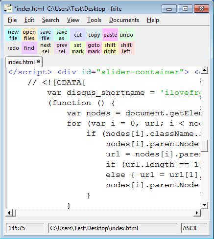 On the image down below you can see that fxite actually comes with a tabbed interface where you can have several documents opened at the same time. Quick access toolbar at the top doesn’t have any kind of icons, only differently colored buttons are available for you to select. Syntax highlighting is gonna be detected automatically as soon as you save a document.