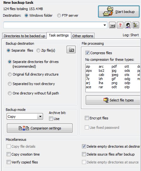 Destination directory can be set at the top, notice the Windows folder or FTP server options. Switch over to the Task Setting tab in the center to turn on compression, encryption and so on. When you’re done, click Start backup.
