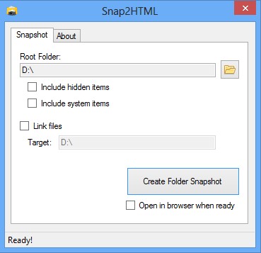 Interface of this free folder structure snapshot creator is very simple and this is a portable application, which means there’s no installation. Root folder is where you select the top directory for which HTML list needs to be generated. Other options for tweaking what will be shown and if you want files linked are available down below. Button for starting the folder snapshots creation is available in the bottom right corner, and that’s about it. Key features Snap2HTML – free HTML folder structure generator are: