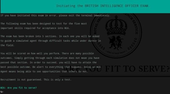 British Intelligence Officer Exam is a free online text adventure game to check whether you are fit to work in MI6. This text adventure game is inspired by the new James Bond movie Skyfall.