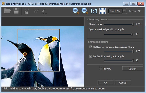 The three buttons next to open and save in the toolbar at the top are for switching between the three conversion methods that we mentioned. Right sidebar holds sliders for adjusting the amount of the painting effect that’s gonna be applied. Key features of RepaintMyImage – free photo to painting converter are: