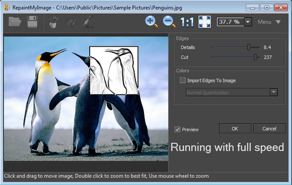 Example of photo to drawing conversion made with RepaintMyImage can be seen on the screenshot below. Only the small preview box is actually transformed, so you can see before/after shot of the effect. Another thing you can see is the actual interface of this free photo to painting converter.