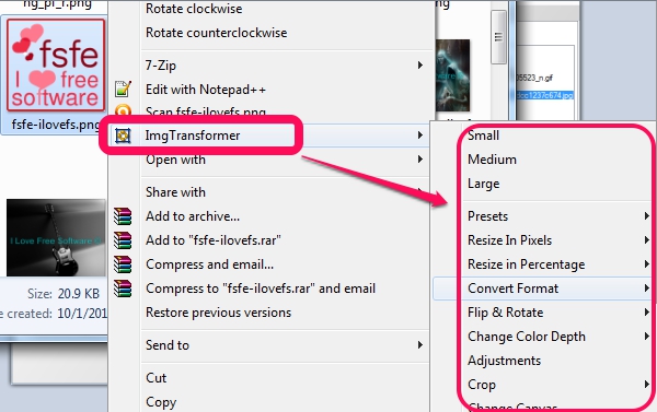 - Integrates with Windows explorer context menu. Thus, you could process an image or multiple images just by right-clicking on selected images, and using ImgTransformer option.