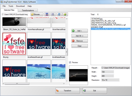 Screenshot below shows interface of ImgTransformer where you can batch resize photos, view thumbnails, and perform other tasks.