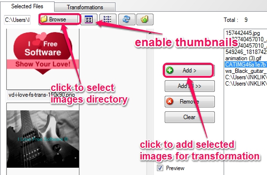 This tab is used to choose a directory containing images. You can also enable thumbnail mode to view preview of added images. From the input images, you can select all or just required images for processing. Select images and use Add button to add them for processing.