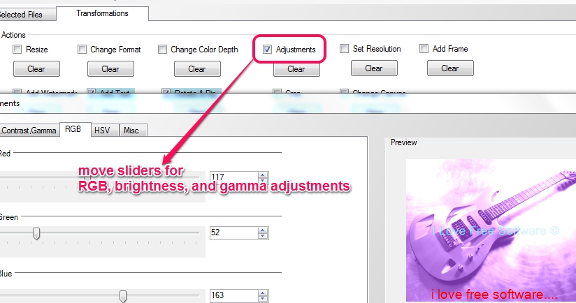 ImgTransformer is a freeware to batch resize photos, convert photos, as well as add watermark to photos. Thus, multiple photos can be processed together with this free software. A lot of output formats are present in this software. For watermark option, it supports both text watermark and image watermark. Apart from these options, you will be able to crop photos, can set adjustments (brightness/contrast/gamma level, RGB, HSV level, etc.), rotate all input images, and can also change canvas size.