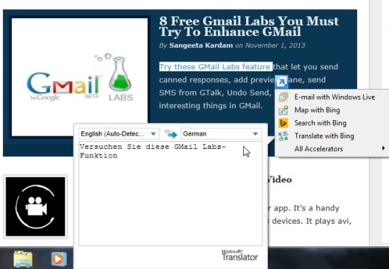 One of the most interesting thing I found in IE 11 preview for Windows 7 is the enhancement of context menu of the selection made on a web page. Earlier it was limited to Bing-enabled search. But now it offers more versatile options like Emailing with Windows Live, Previewing location on Bing Maps, and Language translation tool.