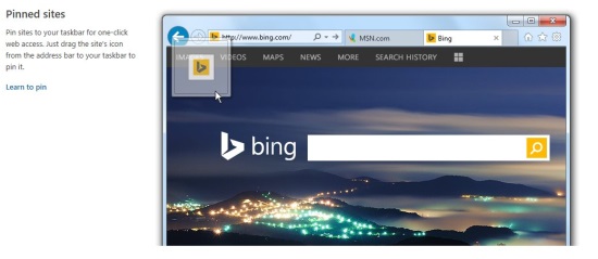 • Pinning sites to taskbar option.