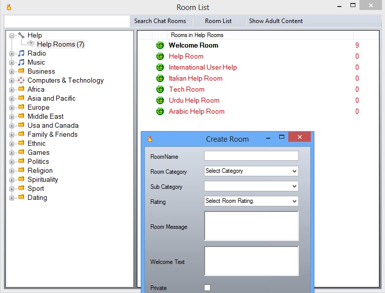 Two main groups are available, offline and online. To access chat rooms, you need to click on All Rooms button which you see there, and from the window that comes up select a chat room that you would like to join.