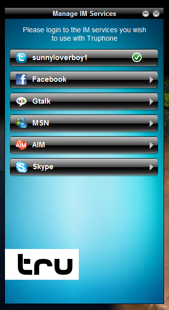 - You can add Truphone and Outlook contacts and can also Manage IM services across Twitter, Facebook, AIM, Skype, MSN, and Gtalk.