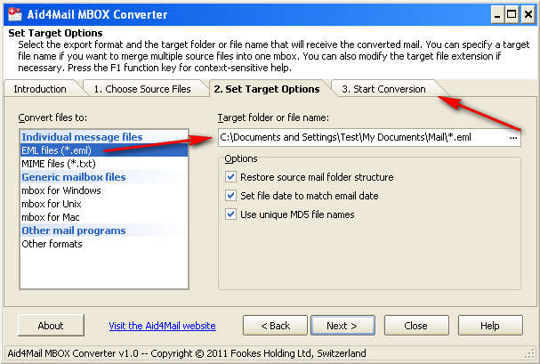 As you can see on the image above, we have selected the .eml format for conversion, there’s also .txt, and a couple of others. Last steps would be clicking Next once again to land on the last tab, the Start Conversion tab, where you’ll be able to, get this, start converting the source emails into the selected destination format :).
